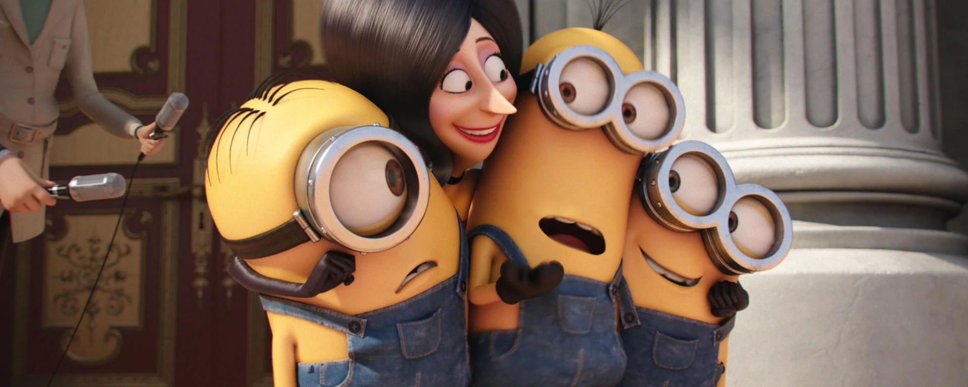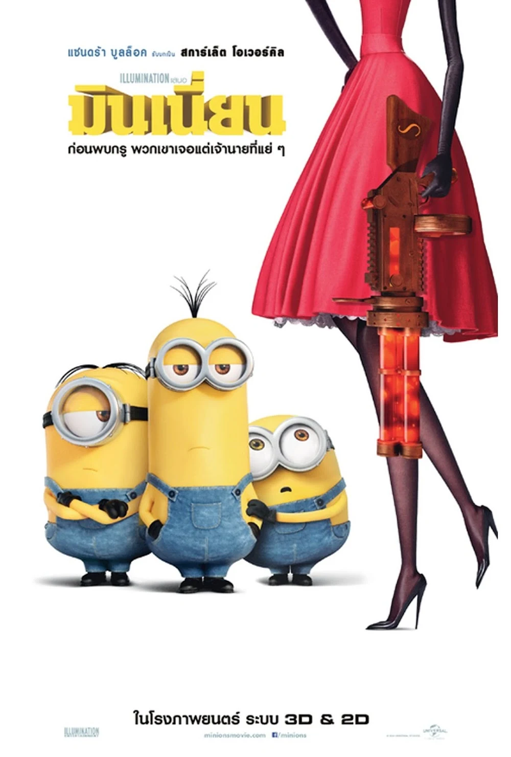 "storyline": "มินเนี่ยน สิ่งมีชีวิตเซลล์เดียว ตัวสีเหลือง พวกเขาวิวัฒนาการขึ้นมาจากเซลล์เล็กๆ เพียงเซลล์เดียวตั้งแต่อดีตกาล พวกเขาทั้งเล็ก แถมมีนิสัย และรูปแบบการใช้ชีวิตที่แตกต่างกัน แต่สิ่งหนึ่งที่พวกเขามีเหมือนกัน คือพวกเขาต้องการรับใช้จอมวายร้ายสุดแสบทุกราย แต่ให้หลังจากการทำลายหัวหน้าของพวกเขาสารพัด ไม่ว่าจะเป็น ทีเร็กซ์ เจงกีส ข่าน นโปเลียน และแดรกคูลา พวกเขาตัดสินใจที่จะหลีกหนีความวุ่นวายและทำให้หายไปจากโลกนี้ด้วยการไปใช้ชีวิตตามลำพังที่แอนตาร์กติกา\n\nแต่พวกเขากลับพบว่า เมื่อไปใช้ชีวิตแบบนั้นมันทำให้พวกเขาไม่มีความสุขในชีวิตเลย ในปี 1968 (42 ปี ก่อนพบเฟลูเนียส กรู) เควิน หนึ่งในมินเนี่ยนได้ตัดสินใจที่จะออกเดินทางค้นหาจอมวายร้ายเพื่อคืนความสุขให้กับพวกมินเนี่ยนอีกครั้ง เขาตัดสินใจรวมทีมกับ สตวร์ท มินเนี่ยนแรกหนุ่ม และ บ็อบ เด็กน้อยผู้น่ารัก เพื่อร่วมออกเดินทางในครั้งนี้ด้วย จนกระทั่งไปพบกับ สการ์เล็ต โอเวอร์คิลล์ (ซานดรา บุลล็อก) จอมวายร้ายหญิงยอดนิยมในยุคนั้นภายในงานชุมนุมจอมวายร้าย 1968 สการ์เล็ต ตัดสินใจจ้างทั้งสามคนเข้าทำงานในฐานะลูกสมุนใหม่ แต่ความปั่นป่วนของลูกสมุนชุดนี้ ทำให้สการ์เล็ตแอบวางแผนอะไรบางอย่างโดยที่พวกเขาไม่รู้ในระหว่างการเดินทางรอบโลกจนกระทั่งถึงที่หมายสุดท้ายคือ ลอนดอน ที่ๆ พวกเขาจะได้รับใช้สการ์เล็ตในครั้งสุดท้าย ก่อนจะถูกฆ่าล้างเผ่าพันธุ์จนสิ้นซาก"