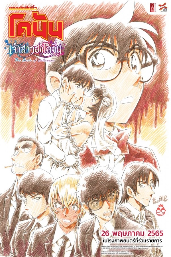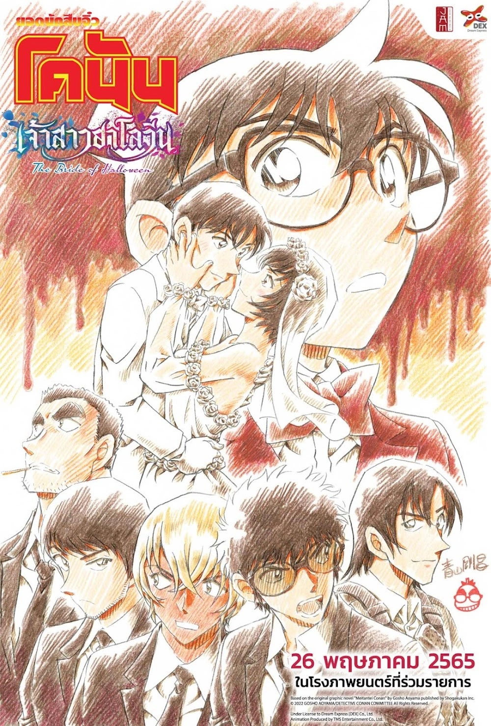 "storyline": "ชิบูย่า กรุงโตเกียว ที่กำลังคึกคักในช่วงเทศกาลฮาโลวีน งานแต่งงานที่กำลังจะจัดขึ้นที่ ชิบุยะ ฮิคาริเอะ โดยที่มิวาโกะ ซาโต้ ที่อยู่ในชุดแต่งงาน ขณะที่โคนันและแขกรับเชิญคนอื่นๆ กำลังอยู่ในบรรยากาศแห่งความสุขนั้น จู่ๆ ผู้ก่อการร้ายกลุ่มหนึ่งก็บุกเข้ามา และวาตารุ ทาคางิ ซึ่งพยายามปกป้องซาโต้ เจ้สาวของเขา จนได้รับบาดเจ็บจากเหตุการณ์นี้ หมวดทาคางิรอดชีวิตและสถานการณ์ดูเหมือนจะคลี่คลายลงไปได้ แต่ในสายตาของซาโต้ เธอได้เห็นภาพทับซ้อนถึงอดีตที่ จินเปย์ มัตสึดะ ชายที่เธอเคยรัก ถูกฆ่าตายในการวางระเบิดเมื่อสามปีที่แล้ว ซ้อนกับ ทาคางิ\n\nในเวลาเดียวกัน เกิดเหตุมือระเบิดได้หลบหนีออกจากเรือนจำ นี่เป็นเรื่องบังเอิญจริงๆเหรอ? เรย์ ฟุรุยะ/โทรุ อามุโระ กำลังตามล่าชายที่ฆ่าเพื่อนร่วมชั้นของเขาและดูเหมือนว่า เขาจะสัมผัสอะไรบางอย่างได้ ว่าเหตุการณ์ในงานแต่งงานของหมวดซาโต้ กับการแหกคุกของมือระเบิดอาจจะมีความเชื่อมโยงกัน และจู่ๆ ก็มีบุคคลลึกลับปลอมตัวมาปรากฏตัวและใส่ระเบิดปลอกคอกับ อามุโระ\n\nโคนันไปที่กบดานใต้ดินที่อามุโร่ ซ่อนตัวอยู่เพื่อหาทางปลดปลอกคอระเบิด และได้รับรู้เกี่ยวกับเหตุการณ์เมื่อสามปีที่แล้ว เมื่ออามุโร่และเพื่อนร่วมชั้นที่เสียชีวิตจากโรงเรียนตำรวจพบระเบิด \"พลามยา\" \n\nขณะเดียวกันในชิบูย่า ขณะที่โคนันและทีมกำลังสืบสวนเพื่อกระชากหน้ากากของคนร้ายออกมาให้ได้ เงาที่น่าสะพรึงกลัวก็เริ่มปกคลุมพวกเขา และเรื่องราวครั้งนี้ก็เกี่ยวพันกับเหล่านักเรียนนายร้อย “ห้าพยัคฆ์นักเรียนตำรวจ” รุ่นเดียวกับมัตสึดะด้วย…\n\nปริศนาครั้งนี้จะจบลงอย่างไร รัตติกาลอันยาวนานใต้เสียงระฆังวิวาห์กลางเทศกาลฮาโลวีนของพวกโคนันยังคงดำเนินต่อไป โคนันและเพื่อนจะเปิดเผยตัวจริงของคนร้ายในครั้งนี้ได้หรือไม่ ? ติดตามได้ใน ยอดนักสืบจิ๋ว โคนัน เดอะมูฟวี่ : เจ้าสาวฮาโลวีน 26 พฤษภาคมนี้ ในโรงภาพยนตร์ทั่วประเทศ"