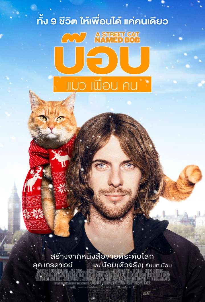 "storyline": "ผลงานสร้างจากหนังสือขายดี ที่กลายเป็นเรื่องราวขับเคลื่อนด้วยพลังและอิงจากเรื่องจริงสุดแสนประทับใจ\r\n\r\nเมื่อเจมส์ โบเวนพบแมวสีส้มที่เจ็บป่วยอยู่ตรงทางเดินเคหะสถาน เขาก็ไม่นึกว่าชีวิตของเขาจะเปลี่ยนไปได้เพียงนี้ จากเดิมเขาต้องร่อนเร่พเนจร เขาได้ช่วยชีวิตแมวตัวนั้นซึ่งเขาตั้งชื่อว่าบ๊อบ แมวตัวนั้นกลายเป็นคู่หูที่แยกจากกันไม่ได้ การเดินทางร้องเพลงเปิดหมวกของทั้งคู่ช่วยเติมเต็มระหว่างกันและกัน และเยียวยาบาดแผลในอดีตของทั้งคู่อีกด้วย"