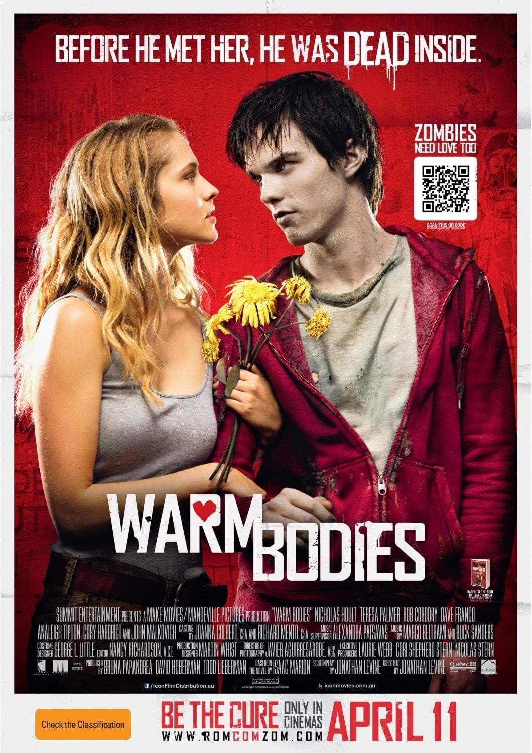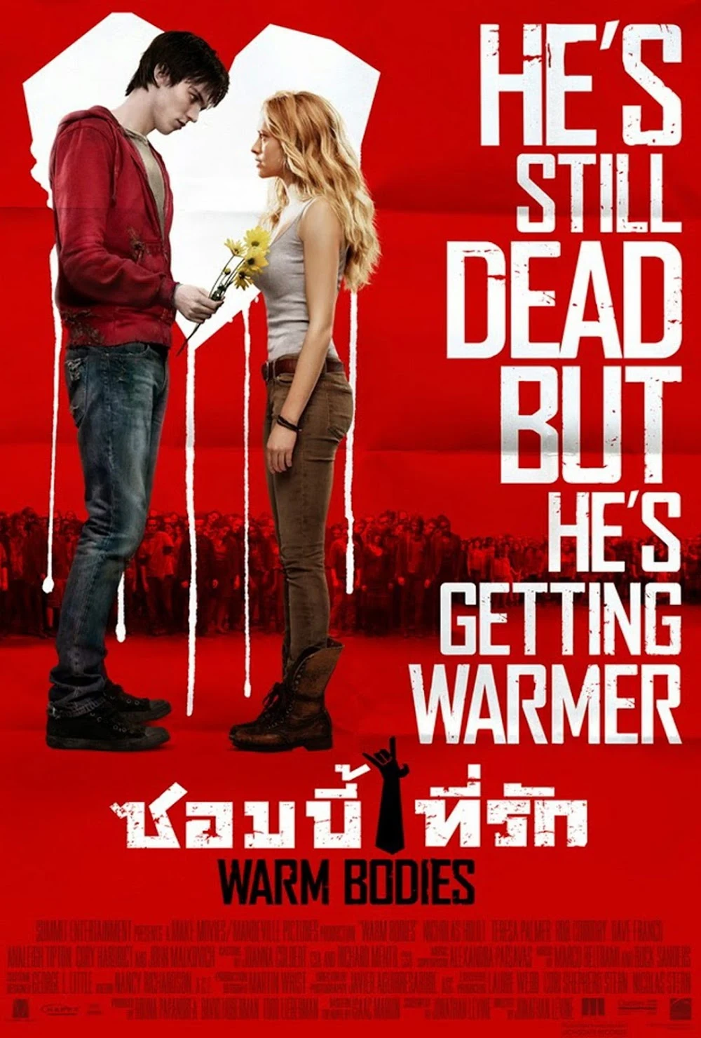 "storyline": "Warm Bodies เป็นเรื่องของซอมบี้ที่เรียกตัวเองว่า อาร์ (รับบทโดย นิโคลัส ฮอลท์ หนุ่มน้อยหน้าใสจาก About A Boy และล่าสุดใน X-Men: First Class) ที่อาศัยอยู่ในโลกที่แทบไม่หลงเหลือมนุษย์ วันหนึ่งเขาได้สัมผัสถึงความทรงจำอันอบอุ่นจากเหยื่อ และตกหลุมรักสาวสวยที่ชื่อ จูลี่ (เทเรซา พาล์มเมอร์ จาก The Sorcerer's Apprentice) ถึงแม้หัวใจของ อาร์ จะหยุดเต้นไปแล้ว แต่วินาทีแรกที่เขาได้เห็น จูลี่ มันทำให้เขารู้สึกถึงเหตุผลของการมีชีวิตตั้งแต่ที่เขาตาย และก็อาจเป็นครั้งแรกที่เขาต้องการกลับมามีชีวิตอีกครั้ง"